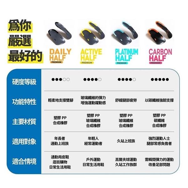 Daily 同Active 適合日常需要💛Platinum 舒緩長期久站工作🩵Carbon 硬度較高,穩定高強度運動嘅後踭🧡Nagomi 同Takumi 款改善拇指外翻腳型🖤