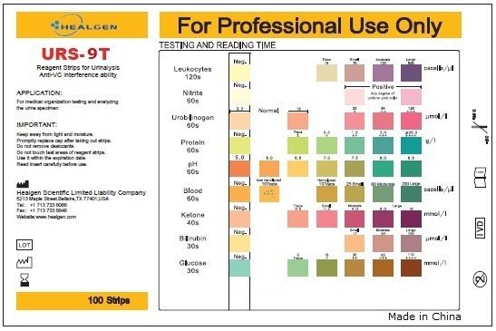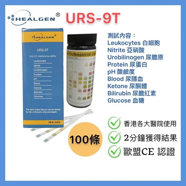HEALGEN - URS-9T 尿液分析 尿試紙/測試條(100條), 測試:白細胞/亞硝酸/尿膽原/尿蛋白/酸鹼度/尿隱血/尿酮體/尿膽紅素/血糖