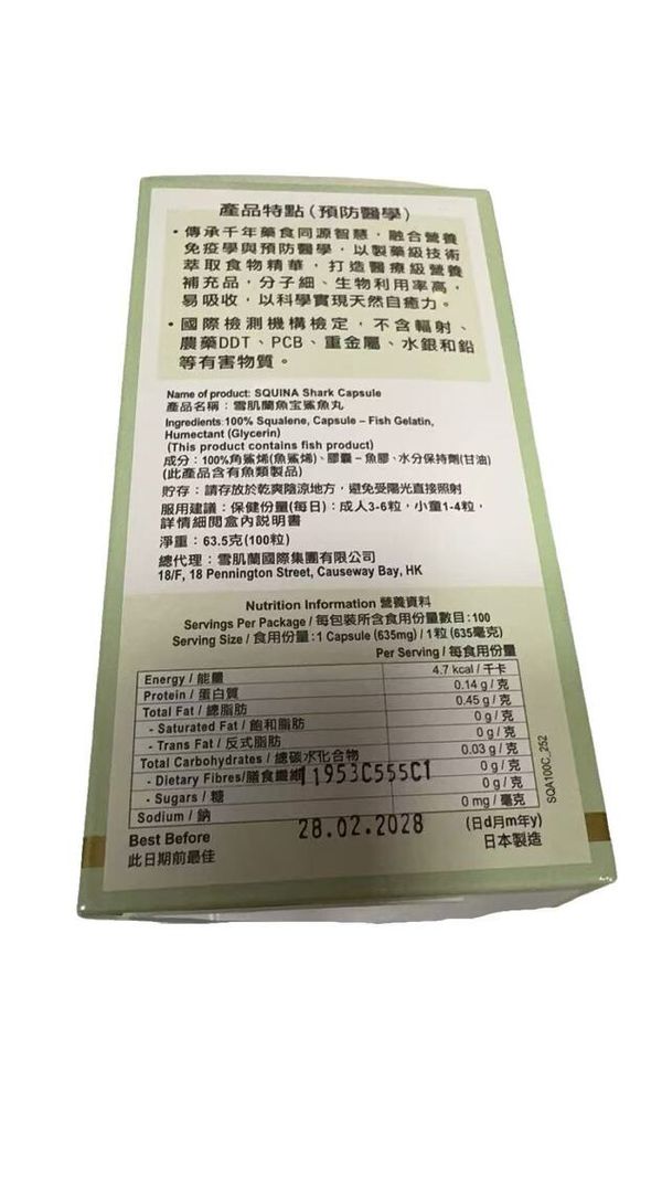 含100%天然魚鯊烯産品,提取自珍稀鯊肝精華,為身體注入源源氧分,有效補肺護肝,排毒淨白,激活細胞,促進新陳代謝,火速提升身體機能,健體同時美肌,助您重拾年輕。更不惜工本,采用打造彈性肌的天然魚骨膠原(Fish collagen)作外殼,嫩膚效果進一步提升,塑造細滑、光澤完美肌,激活青春健康密碼。