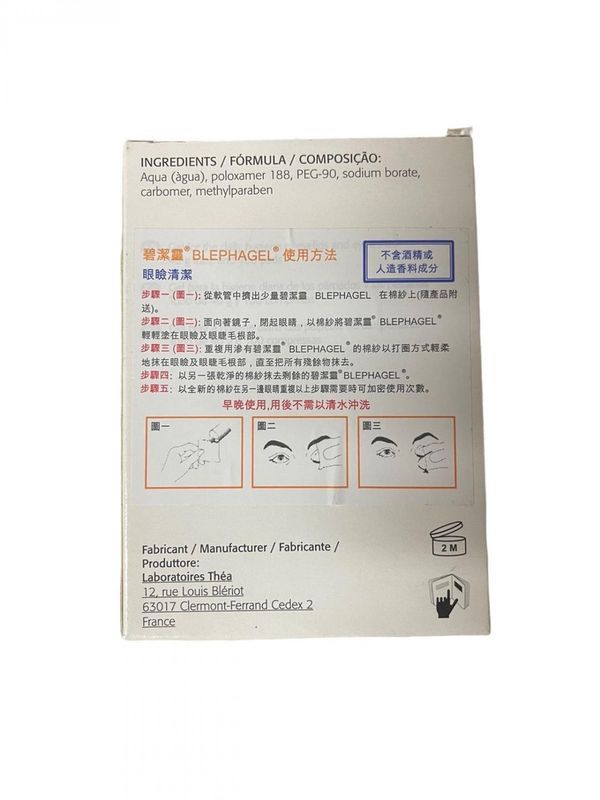 一盒碧潔靈包含一支40g Blephagel和100片棉紗,用於日常護理敏感眼瞼和睫毛。