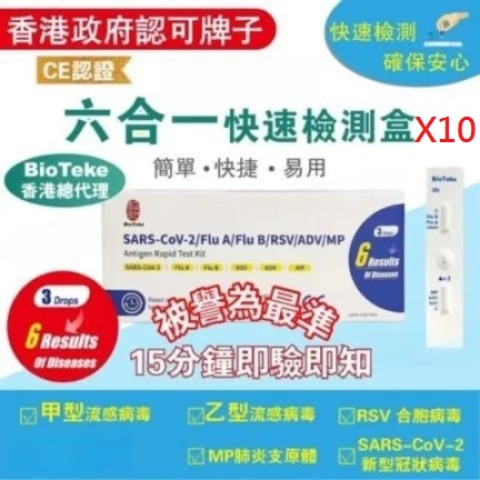 BIOTEKE 6合1 新冠病毒/甲/乙型流感/RSV合胞/ADV腺病毒/MP&Flu肺炎快速抗原檢測試劑盒 10支(獨立包裝)