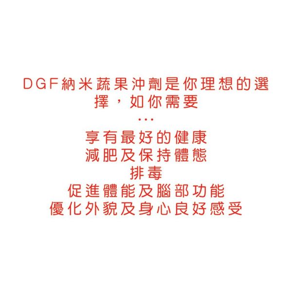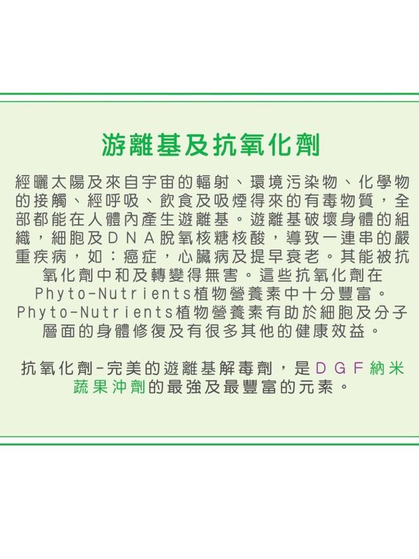 終極健康人生就在眼前。DGF納米蔬果沖劑能夠提供超過十份蔬果的植物營養素及抗氧化物的能量。植物營養素是植物中的重要維生及抗氧化元素,含於生果,蔬菜(尤其是深綠色的),草本植物及植物香料內,能促進健康和抗病能力。您會在DGF納米蔬果沖劑找到全面的植物營養素及少於50卡路里的能量,為注重體重人仕的理想補充劑。