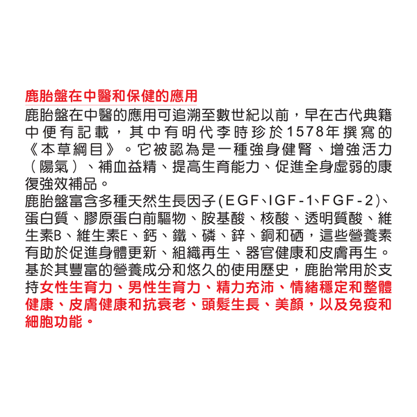 鹿胎盤富含多種天然生長因子(EGF、IGF-1、FGF-2)、蛋白質、膠原蛋白前驅物、胺基酸、核酸、透明質酸、維生素B、維生素E、鈣、鐵、磷、鋅、銅和硒,這些營養素有助於促進身體更新、組織再生、器官健康和皮膚再生。基於其豐富的營養成分和悠久的使用歷史,鹿胎常用於支持女性生育力、男性生育力、精力充沛、情緒穩定和整體健康、皮膚健康和抗衰老、頭髮生長、美顏,以及免疫和細胞功能。