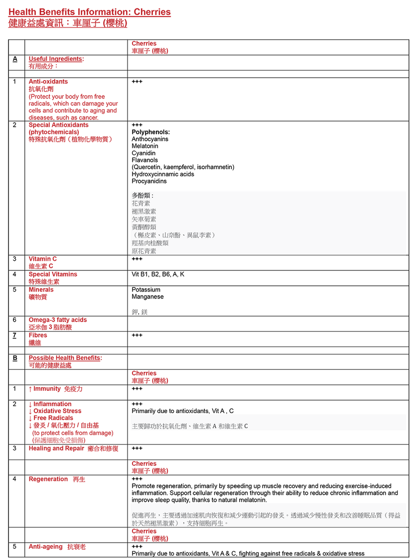 車厘子含豐富維他命C、花青素及鐵質,降低了血清尿酸水平,可以改善痛風,有助血液製造及令關節健康。