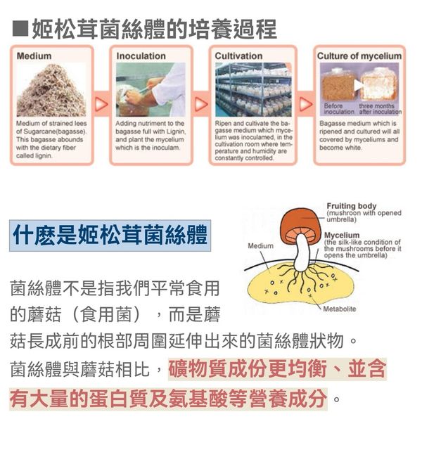 菌絲體與蘑菇相比,礦物質成份更均衡、並含有大量的蛋白質及氨基酸等營養成分。