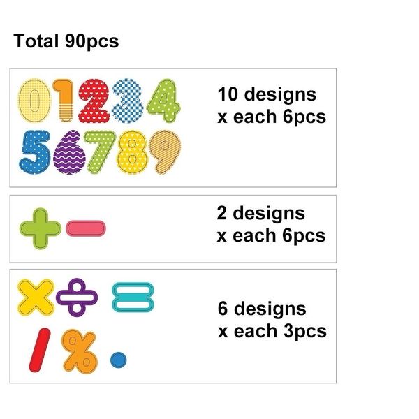 包括總數90片的數字以及數學符號磁貼,不同顏色的數字符號,有助刺激小朋友視覺和觸覺,對於數學能力較弱的小朋友特別有幫助。