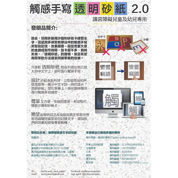 觸感手寫透明砂紙,由一位香港讀寫障礙資優年青人發明,特別證明對讀寫障礙小朋友學習中文的效果。