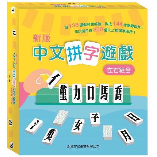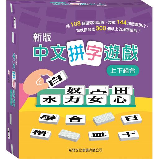 中文拼字遊戲 禮盒套裝,包括 中文拼字遊戲 上下組合 禮盒裝 及 中文拼字遊戲 左右組合。禮盒裝。適合6-12歲小童,共運用216個拼合率較高的偏旁和部首,製成288塊拼片,其中12塊是空白的可作百搭用,採用上下、左右組合形式,可以拼合成1100個以上的漢字組合。