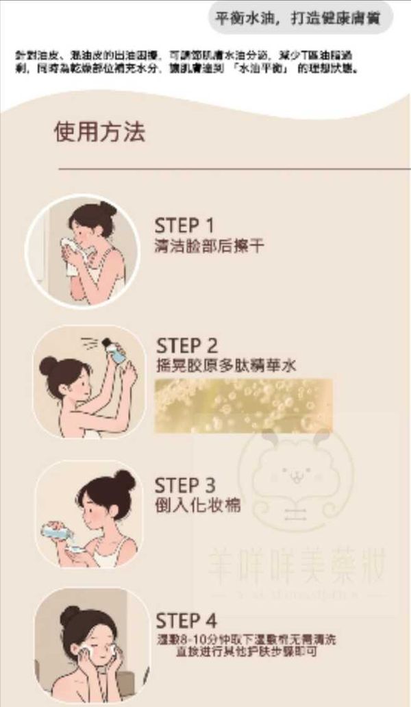 使用方法:潔面後取適量於掌心或化妝棉,輕拍臉部至吸收,可早晚使用