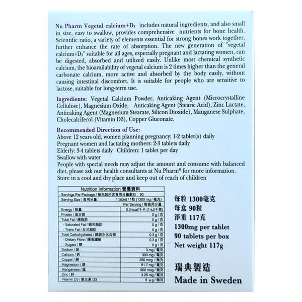 植物鈣粉;氧化鎂;乳酸鋅;硫酸錳;維生素D3;葡萄糖酸銅
