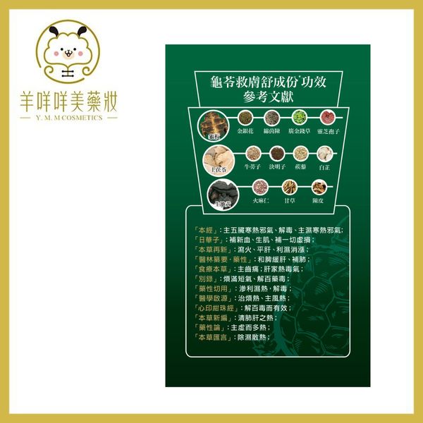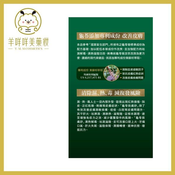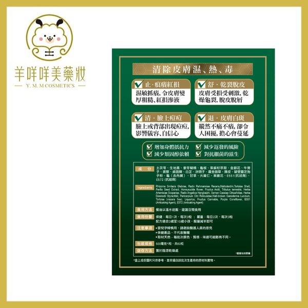 土茯苓、生地黃、麥芽糊精、龜板、紫蘇籽萃取、金銀花、牛蒡子、蒺藜、綿茵陳、白芷、決明子、廣金錢草、陳皮、破壁靈芝孢子粉、龜(去內臟)、甘草、火麻仁、紫錐花、E551 (抗結劑)、E572 (抗結劑)