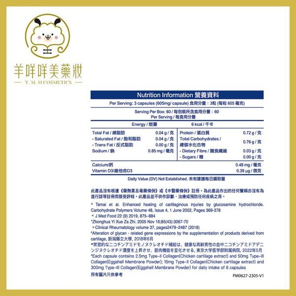 鹽酸鹽葡萄糖胺、難消化糊精、甲基硫醯基甲烷、卵殼膜(三型膠原蛋白)、硬脂酸鈣 (E470 穩定劑)、二氧化矽 (E551 抗結劑)、薑黃提取物、二型膠原蛋白(含軟骨素)、透明質酸、 β-煙醯胺單核苷酸、咪唑胜肽化合物、棕櫚果提取物、蝦青素、青口素、Aquamin F海藻鈣、維他命D3
