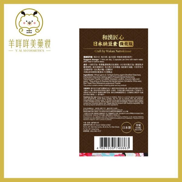 小麥胚芽油、軟膠囊(膠凝劑(改良澱粉)、水分保持劑(甘油)、膠凝劑(多醣增稠劑))、納豆激酶粉末、乳化劑(大豆卵磷脂、脂肪酸甘油酯)、米胚芽及大豆發酵萃取*、乳化劑(米蠟)、紅麴粉末