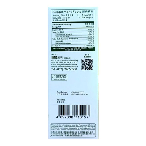 【產品成分】:5種綠野菜萃取 (青瓜、西芹、青椒、苦瓜、青蘋果)、蘆薈精華、綠茶萃取、有機大麥苗粉、黃金小麥纖維