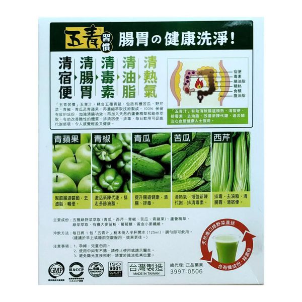 【建議用法】:每日將1包「五青汁」粉末倒入半杯開水(125ml),調勻即可飲用。建議早上或睡前空腹服用,效果更佳