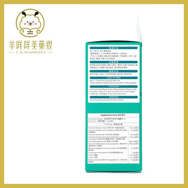 維生素B6、維生素B1、維生素B3、鎂、維生素B2、鋅、KSM-66 印度人參提取物、肌醇、酒石酸氫膽鹼、葉酸、維生素B12