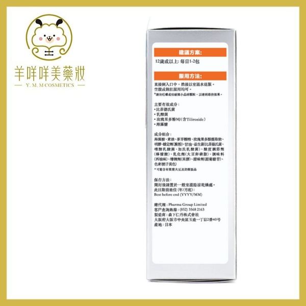 海藻糖、素油、麥芽糊精、玫瑰果多酚提取物、 明膠、穩定劑(澱粉)、甘油、益生菌(比菲德氏菌、 嗜酸乳酸菌、加氏乳酸菌)、酸度調節劑(檸檬酸)、乳化劑(大豆卵磷脂)、調味料(西柚味)、增稠劑(果膠)、甜味劑(甜菊糖苷)、色素(梔子黃色)
