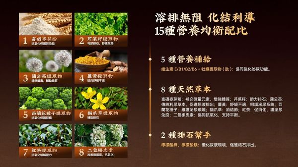富硒麥芽粉:補充微量元素,增強體質; 芹菜籽:助力排石;