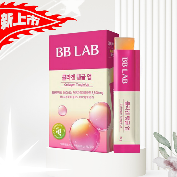 這款產品是「BB LAB Collagen Tangle Up」,一款含有低分子膠原蛋白的健康補充劑,專為提升肌膚彈性和保濕而設計。