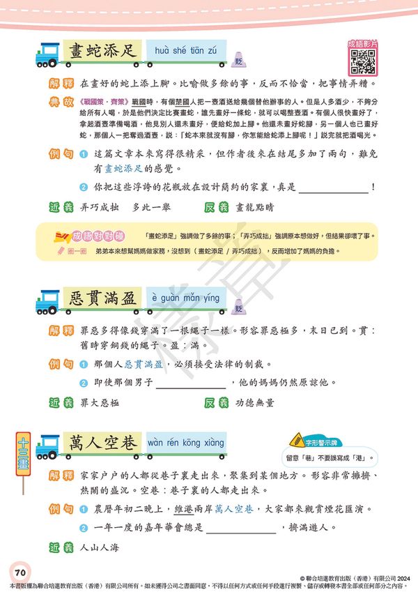 • 設有例句,其中一個例句會讓學生填寫,幫助學生掌握成語寫法及用法