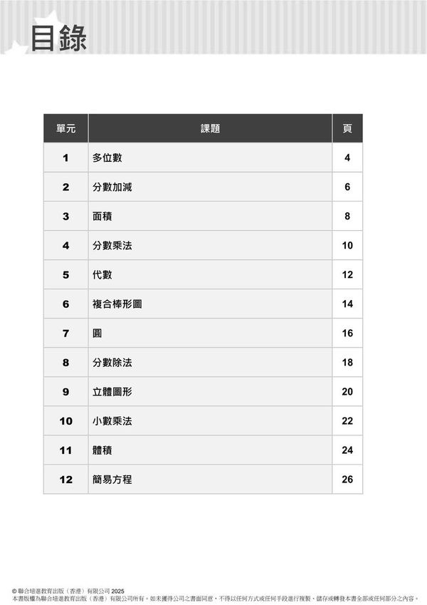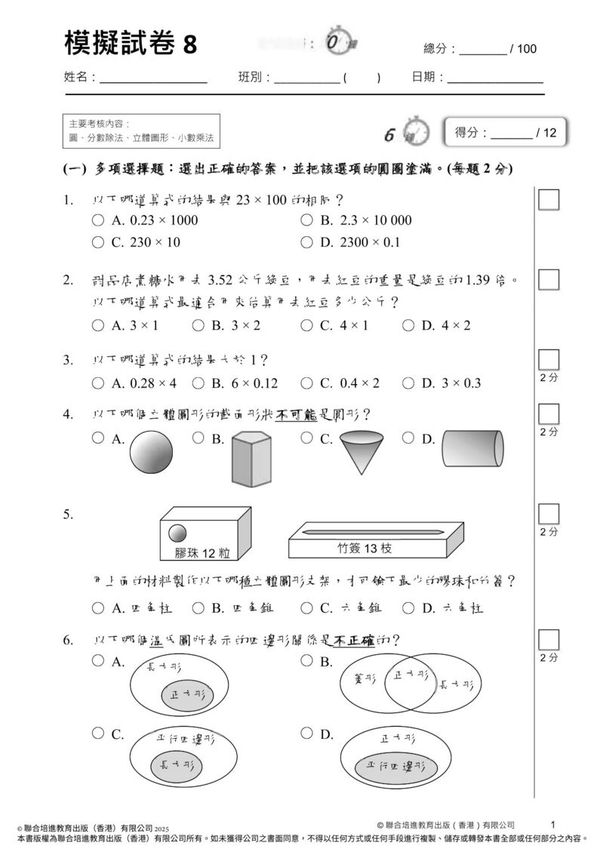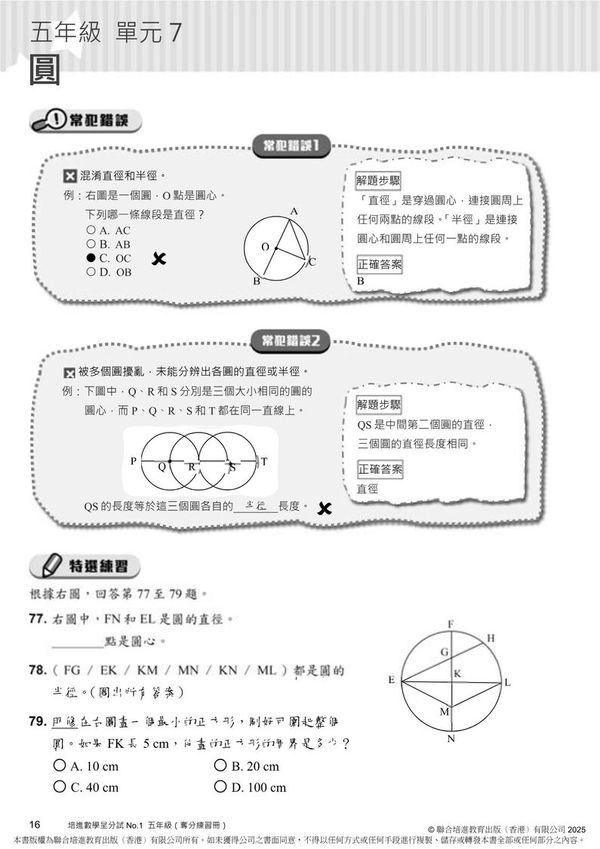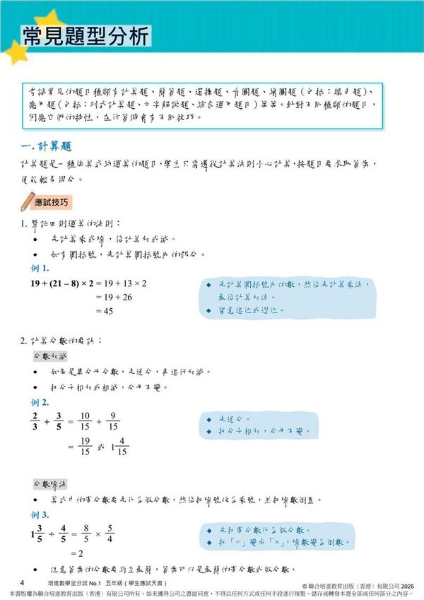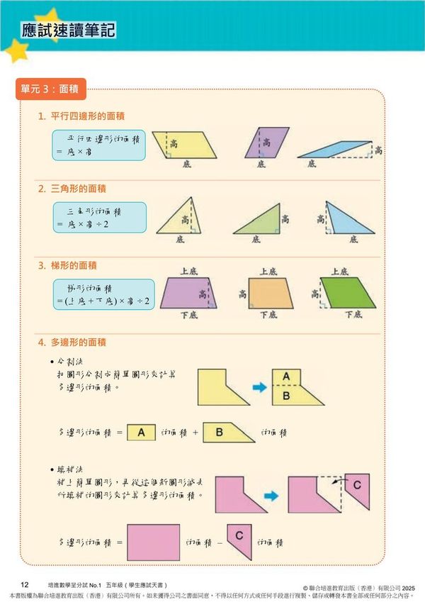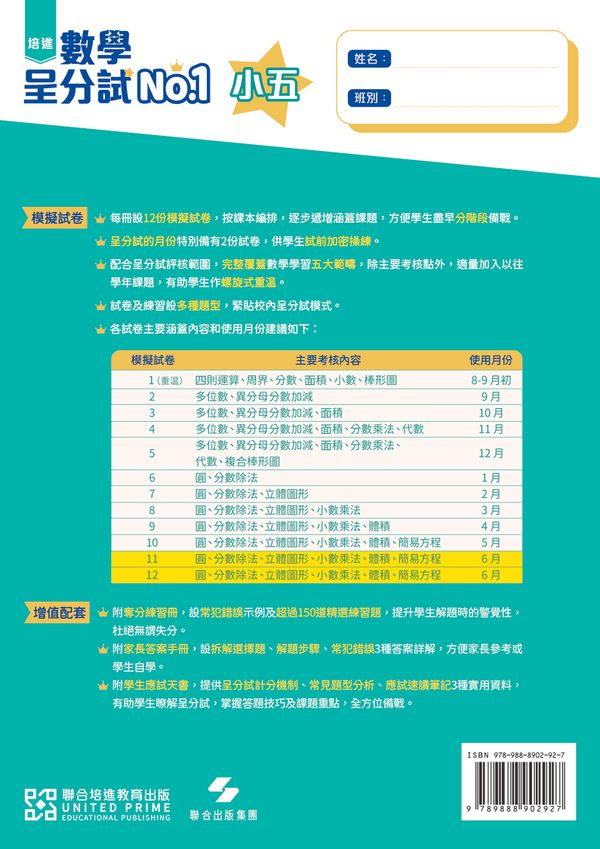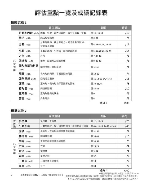•配合呈分試評核範圍,完整覆蓋數學學習五大範疇,除主要考核點外,適量加入以往學年課題,有助學生作螺旋式重温。