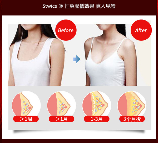 Stwics.增胸儀器通過科學不傷害乳房為基礎,利用恒負壓原理的牽引力誘導乳房細胞生長擴張,