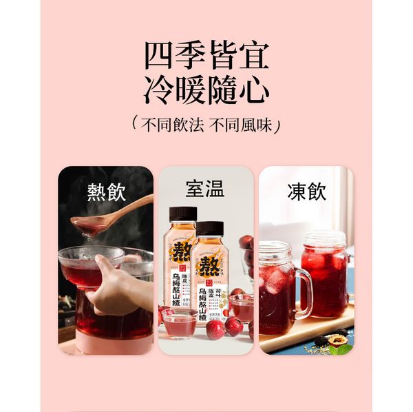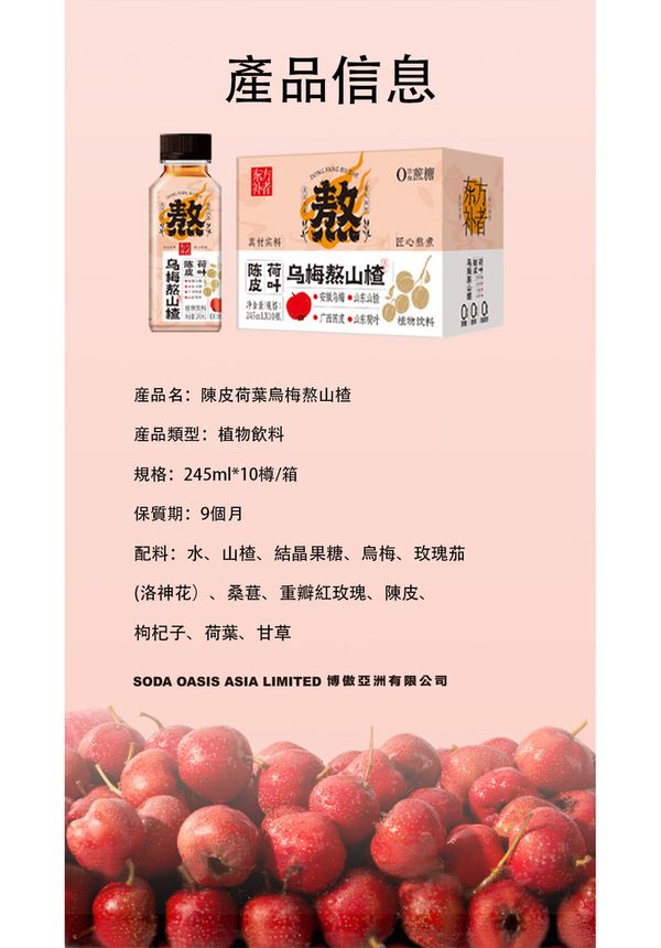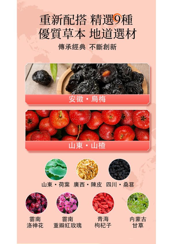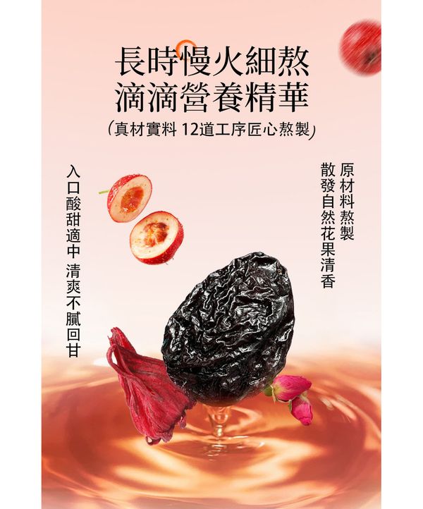 配料 水,山楂、蘋果濃縮汁、烏梅,玫瑰茄洛神花、桑葚、重瓣紅攻瑰、陳皮、柯杞子,荷葉、甘草