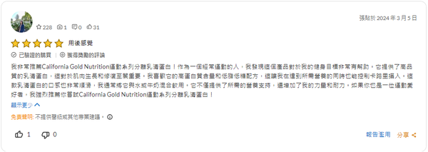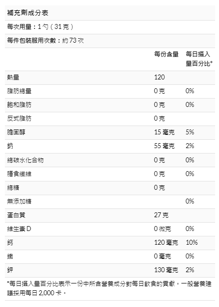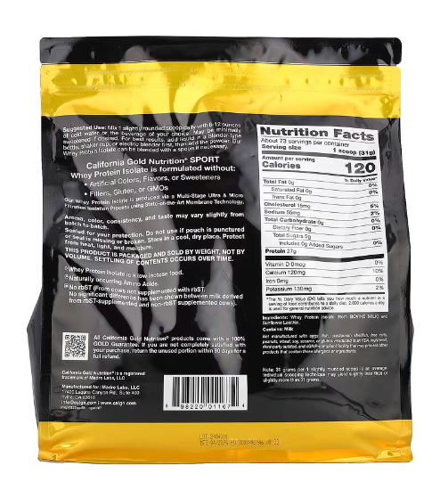 California Gold Nutrition Sport分離乳清蛋白每份含 27 克蛋白質和 6.2 克支鏈氨基酸。乳糖含量低,通過使用先進的膜技術的多級冷微濾分離工藝生產。