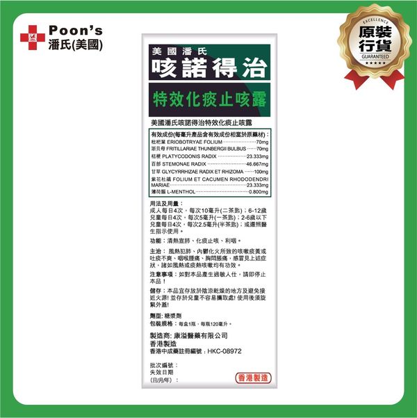 潘氏(美國)咳諾得治特效化痰止咳露 120ml
