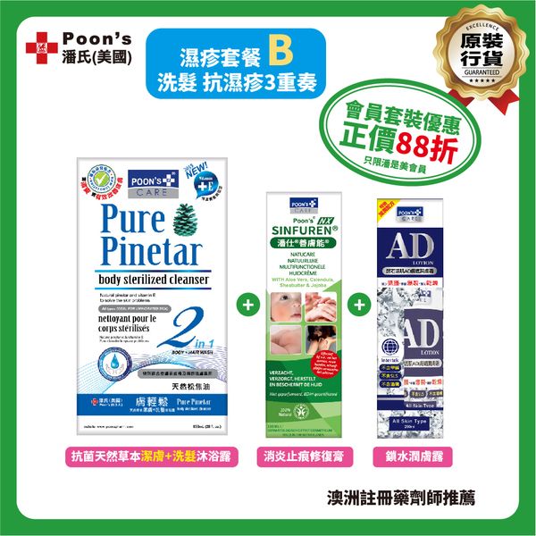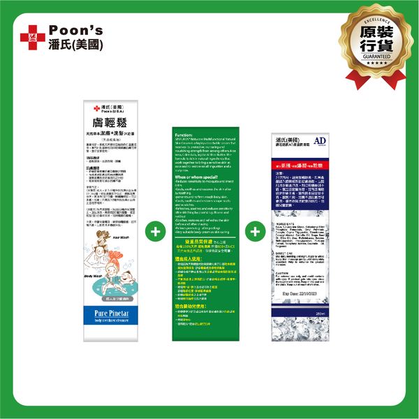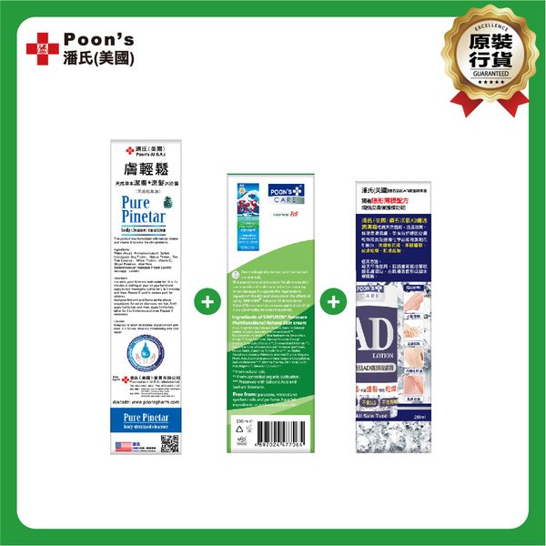 濕疹救星套餐B: 潘氏(美國)膚輕鬆天然草本潔膚+洗髮沐浴露 850ml + 潘氏(美國)善膚能有機天然護膚霜 100ml + 潘氏(美國)鑽石活肌AD膚適潤膚霜 250ml