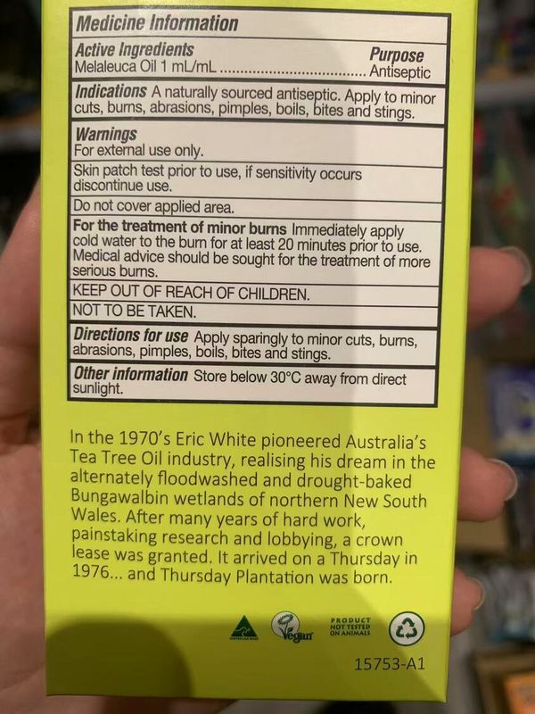 100%纯茶树油:茶树油提炼自特选的茶树叶,具有天然的抗菌和清洁功效。