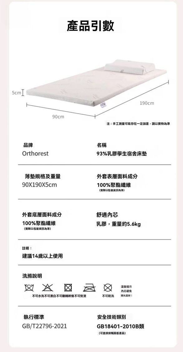 93%乳膠學生宿舍床墊 90cm x 190cm x 5cm