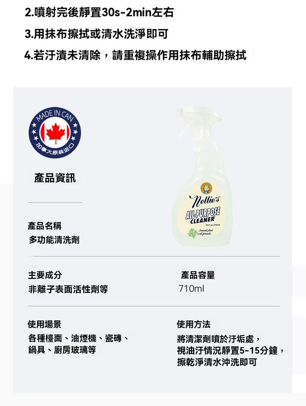 Nellies 加拿大進口多功能清潔劑 廚房去油漬重油污強力噴霧 710ML