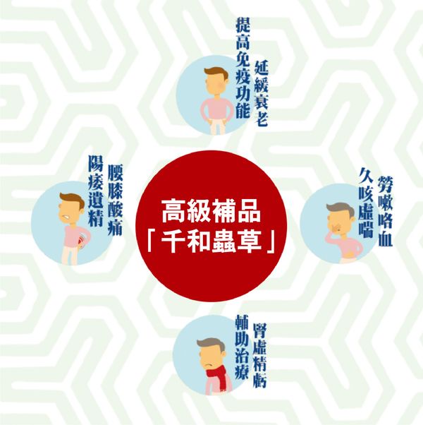 產自青藏高原海拔3,500~5,000米的高寒草甸,自古以來既是名貴的傳統藥材,也是宮廷貴族滋補養生的聖品。 冬蟲夏草具補腎益腎作用。能逆轉腎損傷,預防腎裹竭。 冬蟲夏草還能抗炎益肺,阻滯肺纖維化。 傳統中醫將冬蟲夏草用於治療腎虛精虧、陽痿遺精、腰膝酸痛、久咳虛喘、勞嗽咯血等症狀。 對體質較虛弱人士,冬蟲夏草還具提高免疫功能、延緩衰老之功效。