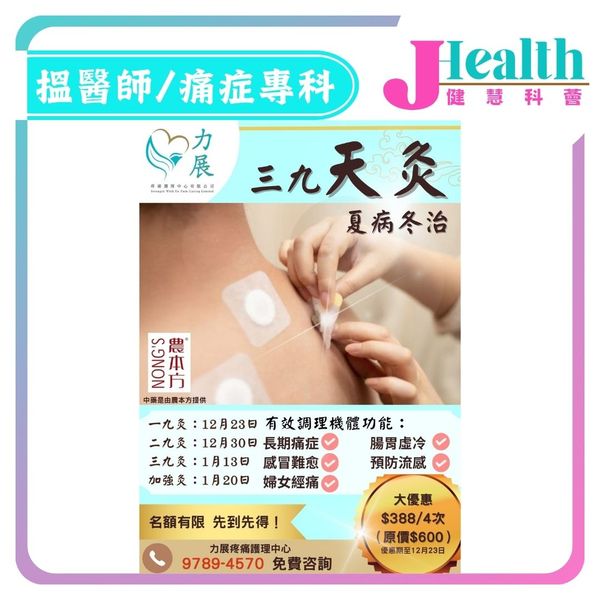 三九灸季節的到來,我們特別推出限時優惠套餐$388(原價$600)(力展中醫三九天灸治療(4次包加强灸)),包含首次體驗療程套餐折扣及健康諮詢禮包,讓每一位追求健康的朋友都能享受到這份來自中醫藥智慧的温暖守護。