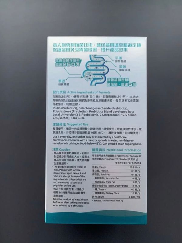 菊粉(益生元)、低聚半乳糖(益生元)、聚葡萄糖(益生元)、本地大學研發綜合益生菌(3種雙歧桿菌及2種鏈球菌,每包含有125億菌落數目)、刺雲豆膠。