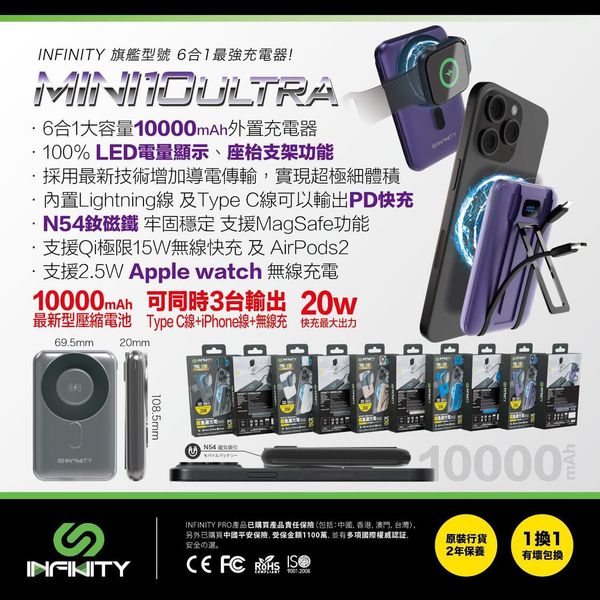 紫色 INFINITY - Mini10 Ultra 10000mAh 旗艦型號 6合1最強充電器 充電寶 power bank 尿袋