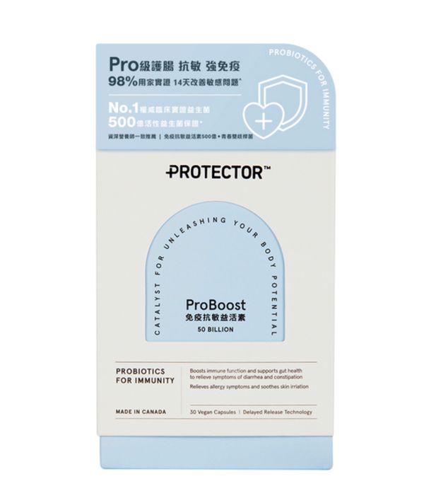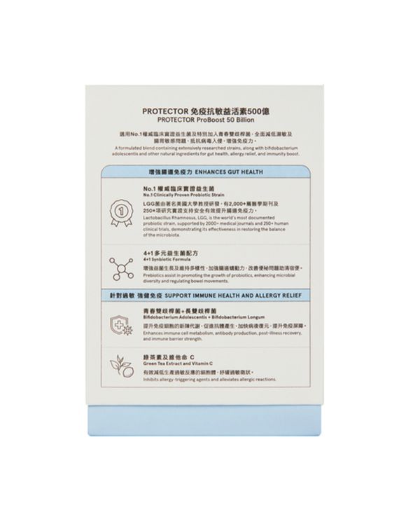 Protector 免疫抗敏益活素 500億選用 No.1權威臨床實證益生菌及特別加入青春雙歧桿菌,全面減低濕敏及腸胃敏感問題,抵抗病毒入侵,增強免疫力。