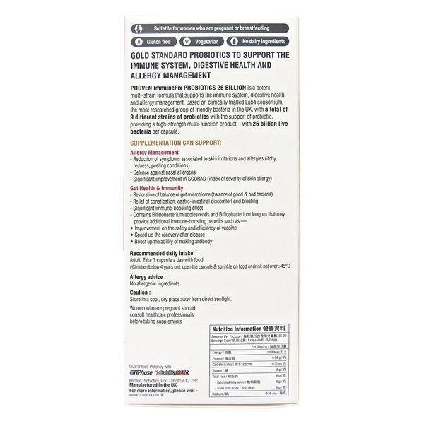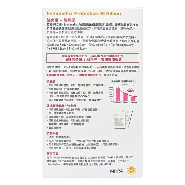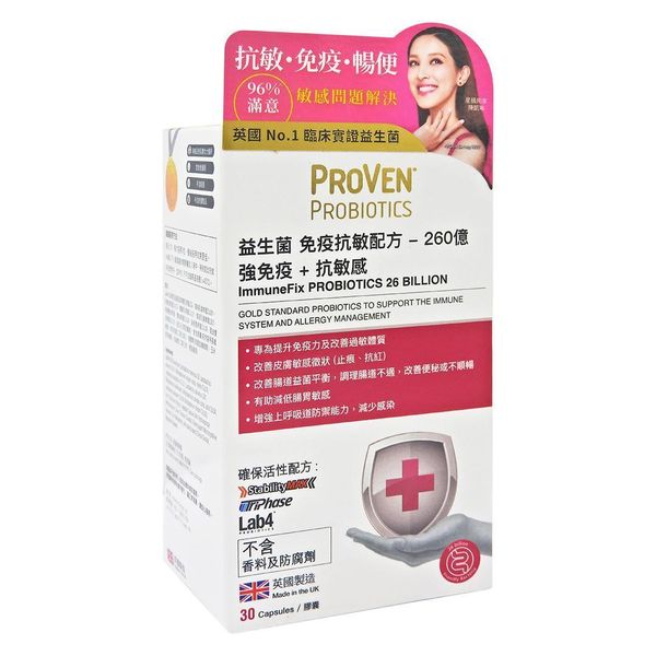 英國 PROVEN ImmuneFix 免疫抗敏益生菌配方 260億 - 是專為提升免疫力及改善過敏體質而設的益生菌配方,有效改善腸道健康、提升免疫力、抗病毒入侵及減低濕敏問題。
