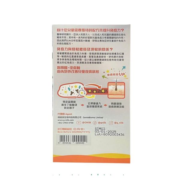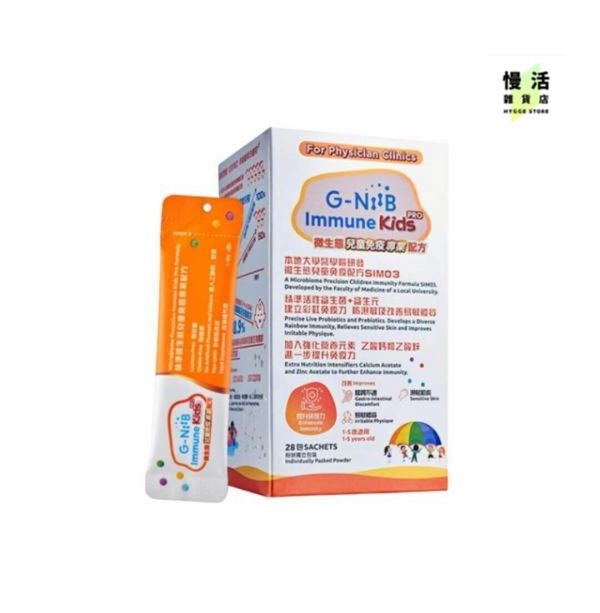 G-NiiB Immune Kids Pro 微生態兒童免疫配方【專業版】SIM03 是由本地大學醫學院研發及臨床驗證,專為1-5歲兒童而設,助兒童建立彩虹免疫力,防濕敏及改善易敏體質,同時改善兒童腸道微生態 有助舒緩兒童腸胃不舒適。