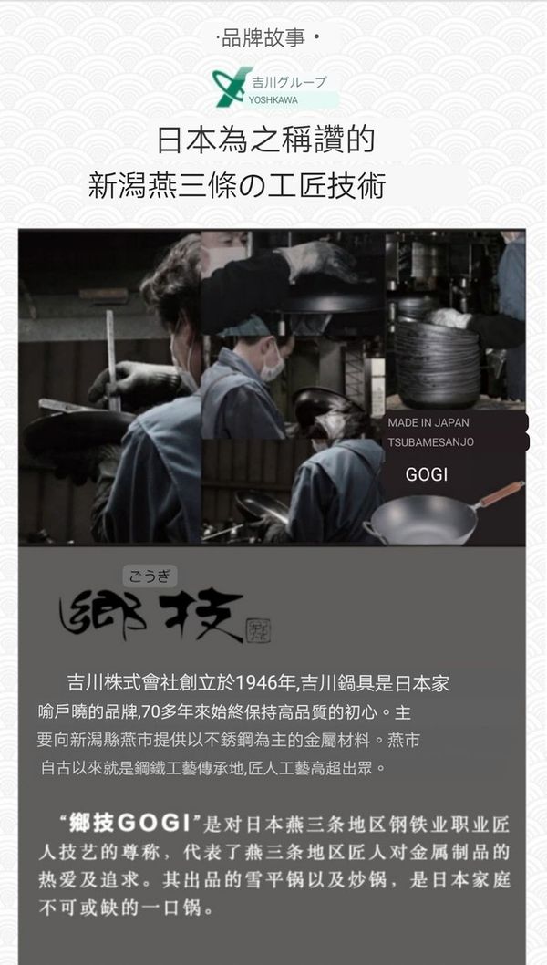 吉川株式會社創立於 1946年,吉川鍋具是日 本家喻戶曉的品牌,70 多年來始終保持高品質 的初心。主要向新潟 縣燕市提供以不銹鋼為 主的金屬材料。燕市 自古以來就是鋼鐵工藝 傳承地,匠人工藝高超 出眾