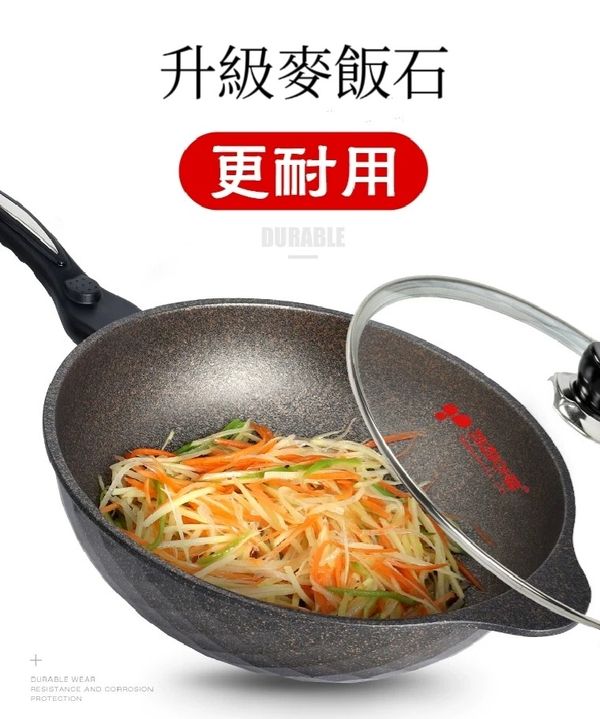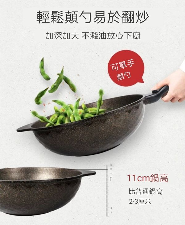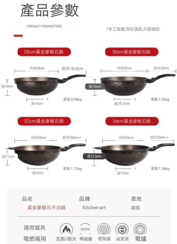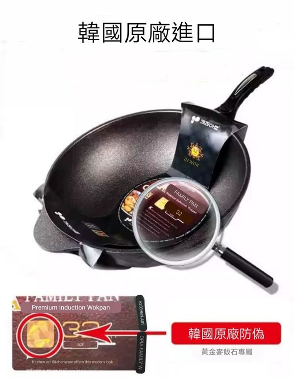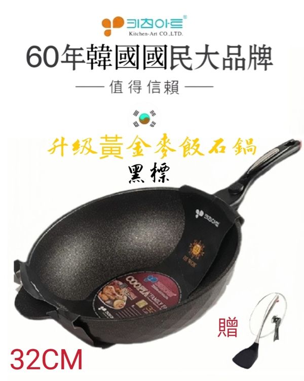 韓國kitchen -Art 升級款黄金麥飯石炒鍋炒鑊不粘鍋不粘鑊平底煎鑊平底鑊平底鍋平底煎鍋易潔鍋麥石鍋電磁燃氣通用鍋黑標32cm medical stone pot wok產地:韓國(贈:蓋+鏟)