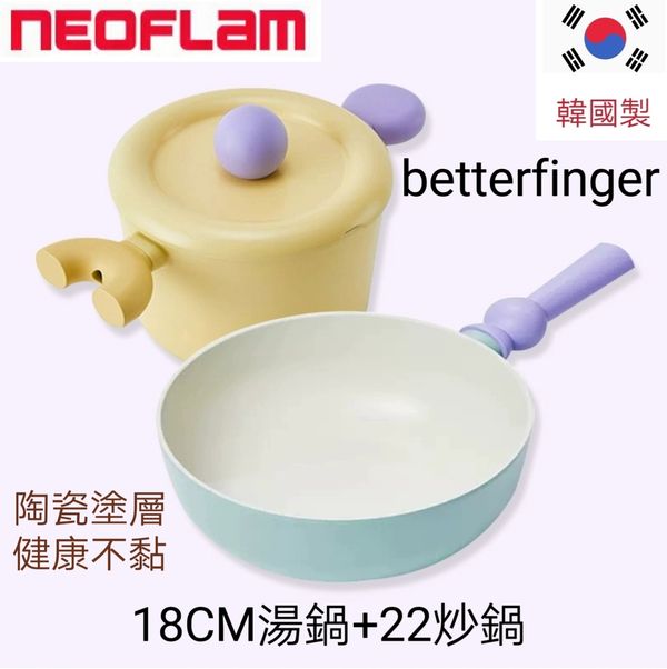 韓國neoflam betterfinger 不粘鍋平底鍋鑊泡泡鍋輔食鍋瑪卡龍鍋炒鍋炒鑊湯鍋奶鍋煎鍋(18cm湯鍋+22cm炒鍋)ceramics pot wok pan産地:韓國 (送鍋蓋矽膠鏟)