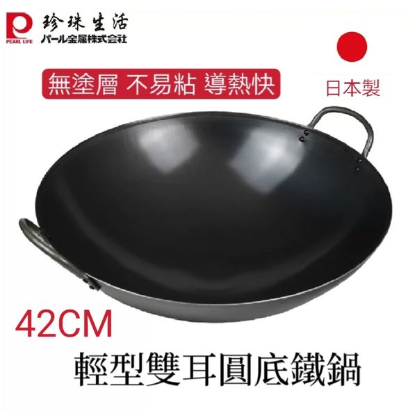 日本製pearl life 珍珠生活輕型雙耳圓底鐵鍋42CM鐵鑊炒鍋炒鑊中華炒鍋中華炒鑊中式鍋中式炒鑊北京鍋鑄鐵鍋純鐵鍋Chinese iron wok (送:鍋蓋十鏟)