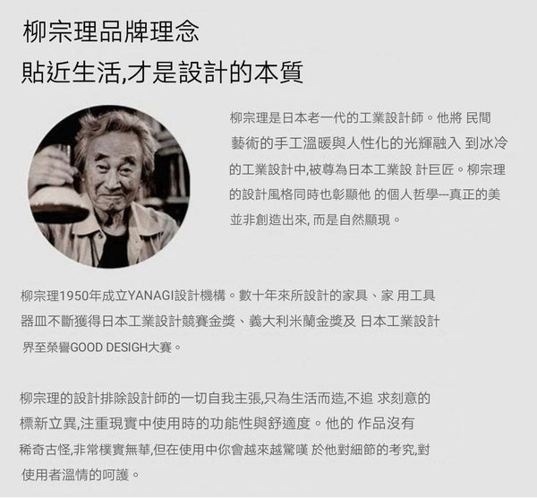 柳宗理1950年成立YANAGI設計機構。數十年來所設計的家具、家用工具 器皿不斷獲得日本工業設計競賽金獎、義大利米蘭金獎及日本工業設計 界至榮譽GOOD DESIGH大賽。