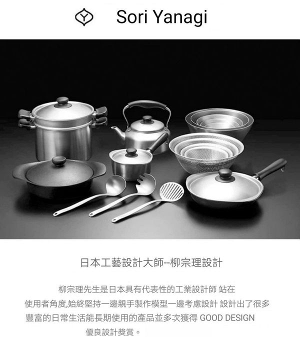 柳宗理1950年成立YANAGI設計機構。數十年來所設計的家具、家用工具 器皿不斷獲得日本工業設計競賽金獎、義大利米蘭金獎及日本工業設計 界至榮譽GOOD DESIGH大賽。