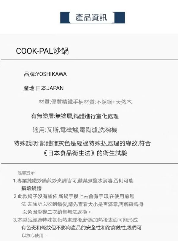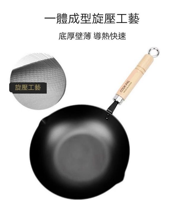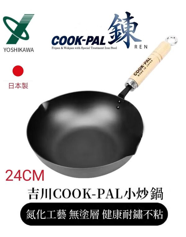 吉川YOSHIKAWA cook-pal錬REN無塗層不粘鍋鐵鑊中式鍋小炒鑊平底煎鑊平底鑊平底鍋平底煎鍋小炒鍋24CM small iron wok pot 產地:日本(送鍋蓋+鏟)