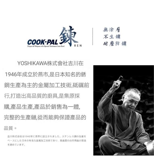 YOSHIKAWA株式會社吉川在1946年成立於燕市,是日本知 名的銹鋼生產為主的金屬加工技術企業.吉川砥礪前行,打造出高品質的廚具,其集原採購,產品生產,產品銷售為一體,具完整的生產鏈,從而能夠確保產品的品質.