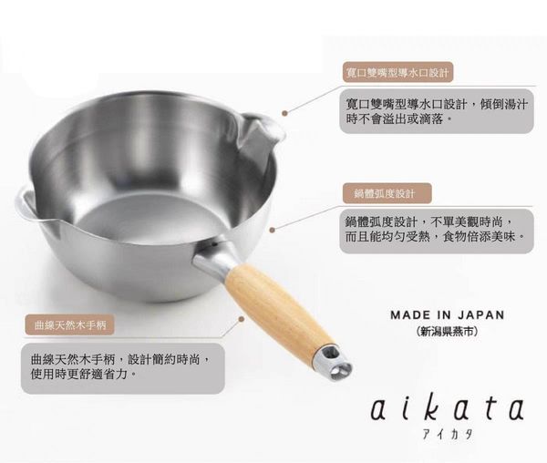日本吉川 aikata 豪華版雙口不鏽鋼雪平鍋,打破傳統設計,通過模塑原塊鐵板,不經焊接製成,配 以特殊雙口設計,在煮食、倒湯時,不會從側面溢出,滴落,煮食時更方便,易清潔。