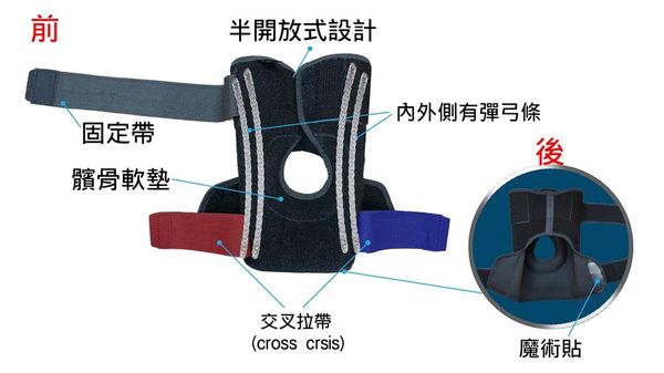 2)將兩條交叉拉帶依序纏繞在膝蓋前方,可調整鬆緊度。